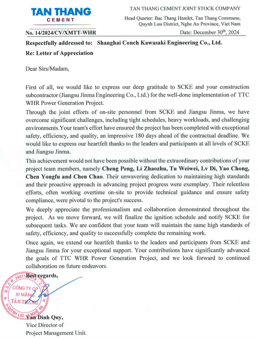 越南項目業(yè)主向海川工程公司發(fā)來感謝信