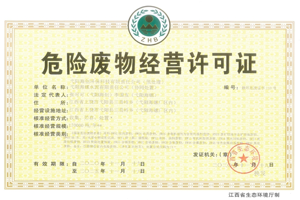 弋陽海創順利取得正式《危險廢物經營許可證》